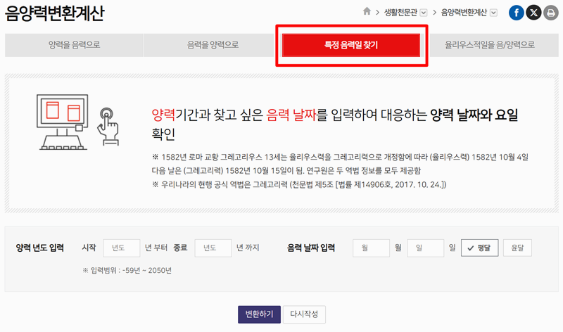 6. 음력 날짜를 기준으로 원하는 기간 안에서 몇 번 등장하는지를 찾을 수 있는 기능이에요. 일정 기간 안의 반복되는 음력날짜를 확인할 때 유용해요.