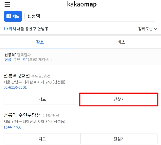 3. 입력한 장소에 대한 검색 결과가 나타나면, 해당 장소 정보 아래에 '길찾기'라는 항목이 보입니다. 이 부분을 선택하시면 이제 본격적으로 출발지에서 목적지까지의 경로를 탐색할 수 있습니다. 예를 들어, '선릉역'을 검색했다면, 역 정보와 함께 길 찾기를 시작하는 항목이 제시될 것입니다.