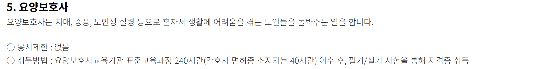 9. 요양보호사는 노인성 질환 등으로 혼자 생활하기 어려운 어르신들의 일상을 돌보는 역할을 합니다. 정해진 교육기관에서 240시간의 교육을 이수한 뒤, 필기와 실기 시험에 합격하면 자격을 얻게 됩니다.
