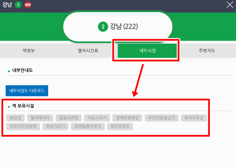 6. 시간표 외에도 '내부시설' 항목을 보면 화장실, 엘리베이터, 물품보관함 등 해당 역의 편의시설 정보를 미리 파악하고 동선을 짜는 데 도움이 됩니다.