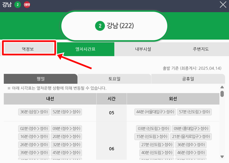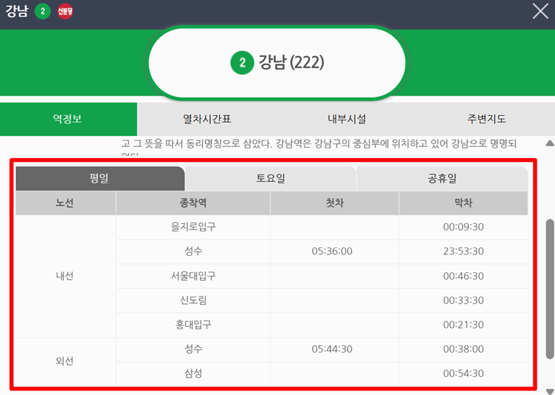 5. 역정보 탭의 시간표에서 평일, 토요일, 공휴일로 나뉜 첫차와 막차 시간을 확인할 수 있습니다. 을지로입구나 성수행처럼 종착역 정보까지 자세하게 나와 있어 편리합니다.