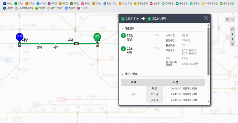 7. 만약 환승이 필요하다면 '노선검색'으로 출발역과 도착역을 설정해보세요. 이동 경로에 맞춰 내가 타야 할 막차 시간을 정확하게 알려주어 유용합니다.