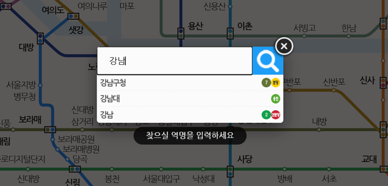 1. 서울교통공사 사이버스테이션의 왼쪽 검색창에 알고 싶은 역 이름을 입력하여 바로 찾을 수 있습니다.