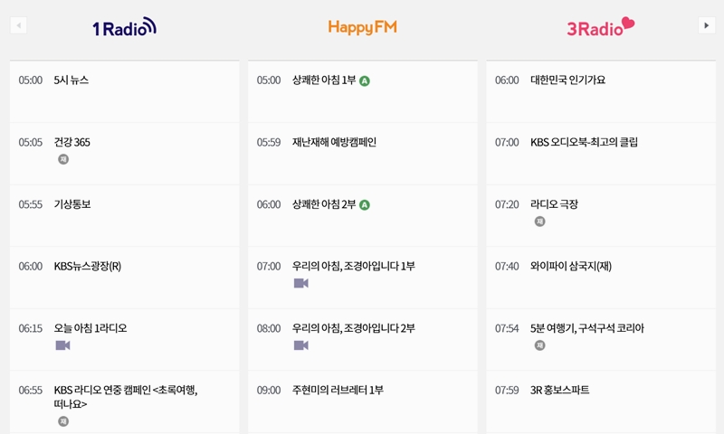 4. 전체 편성표를 누르면 KBS에서 방송되는 모든 라디오 프로그램의 편성표를 확인할 수 있습니다. 1Radio, HappyFM, 3Radio 등 다양한 채널의 방송 일정이 날짜별로 정리되어 있어 원하는 프로그램의 방송 시간을 쉽게 찾을 수 있습니다.