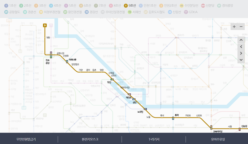 2. 전체 노선도가 나타나면, 상단의 여러 호선 번호 중에서 황금색으로 빛나는 '9호선'을 찾아 선택해 주세요.