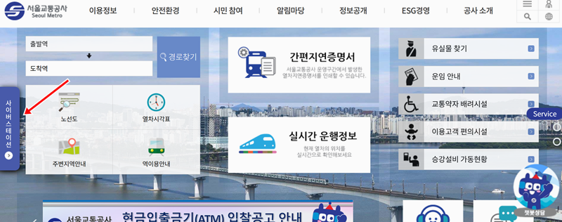 1. 서울교통공사 홈페이지 메인 화면에서 왼쪽의 '사이버스테이션'으로 들어가면 수도권 전체 노선도를 확인할 수 있습니다.