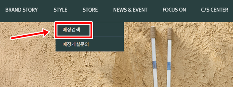 2. 'STORE' 위에 커서를 가져가면 나타나는 작은 메뉴에서 '매장검색'을 선택합니다.