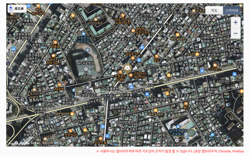 6. 지도는 일반 모습뿐만 아니라 실제 주변 환경을 보여주는 스카이뷰로도 볼 수 있어서, 매장 주변의 모습을 확인하며 위치를 파악하기에 편리합니다.