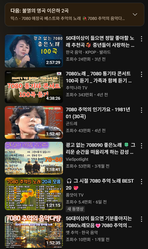 1970년대와 80년대에 많은 사랑을 받았던 대중가요들을 모아 놓은 목록을 찾아 듣는 것이에요. 당시 노래방에서 즐겨 부르던 곡들을 중심으로 구성되어 있어, 그 시절의 추억과 감성을 다시 느끼게 해줍니다. 7080 노래방 애창곡 100은 유튜브 홈페이지에서 이용 가능합니다.
