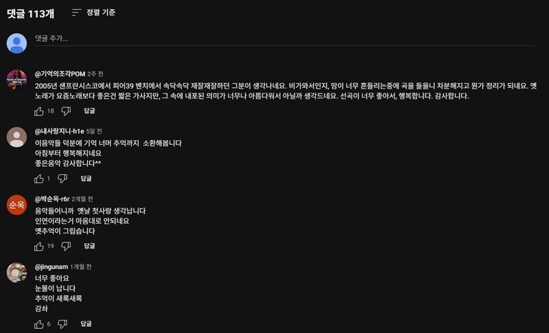 3. 영상 아래쪽에는 다른 사람들의 감상평을 볼 수 있는 공간이 있어요. 음악을 들으며 떠오른 생각이나 추억을 공유하며 다른 이들과 소통하고 공감대를 형성하는 것도 또 다른 즐거움입니다.