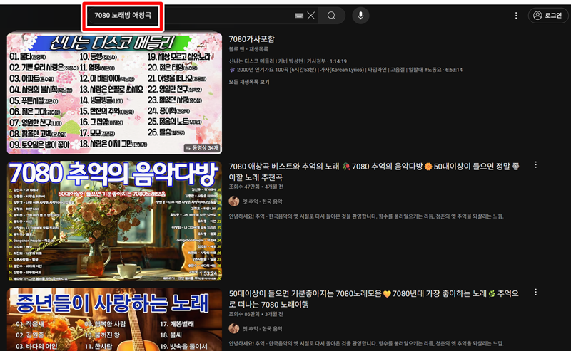 1. 가장 먼저 원하는 노래를 찾아볼 수 있어요. 화면 상단에 있는 입력 칸에 '7080 노래방 애창곡'과 같이 듣고 싶은 음악의 주제를 적어 넣으면, 관련된 여러 영상 목록이 나타납니다.