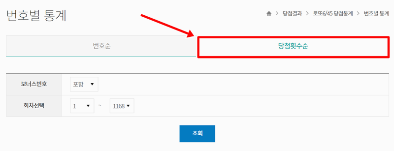 3. 번호별 통계 페이지로 들어갔으면 당첨횟수 순서를 고른 다음에 보너스번호 포함 여부나 회차 범위를 선택해 주세요. 그 후에 확인 버튼을 누르면 설정한 조건에 따라 결과가 나와요. 이 과정에서 원하는 방식대로 번호 정렬도 가능해요.